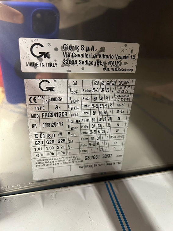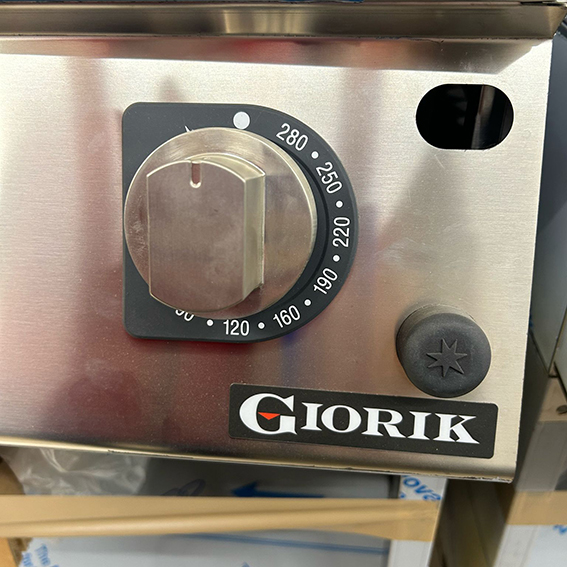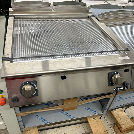 Planxa a gas ratllada amb acabat cromat dur, ideal per a ús professional.