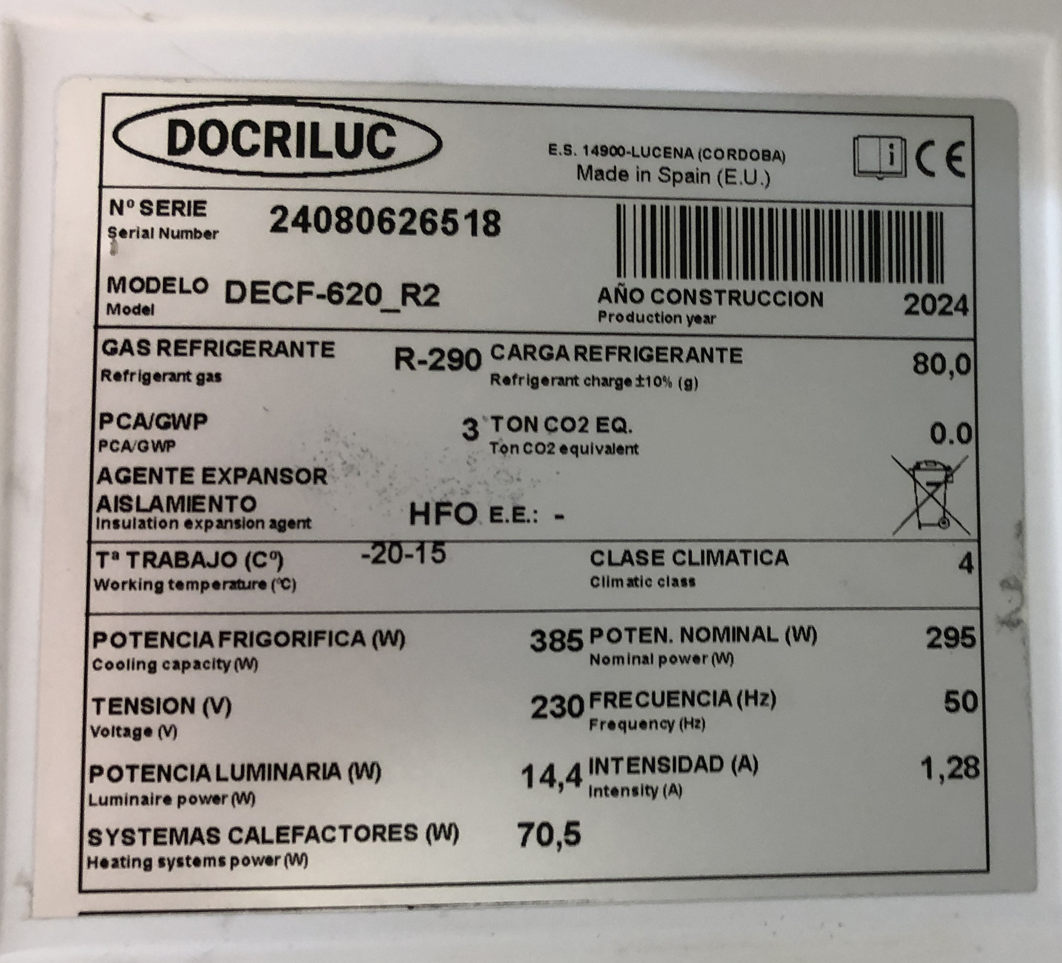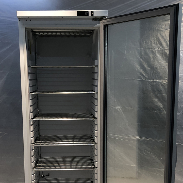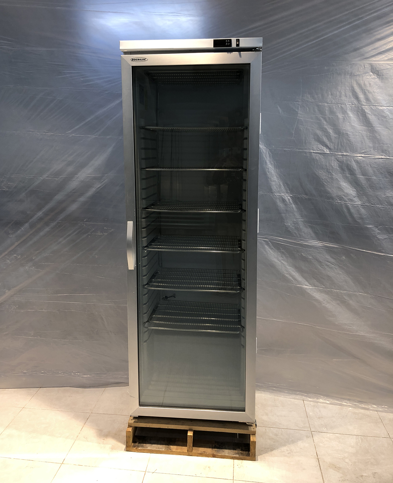 Expositor congelador vertical con refrigeración ventilada y puertas acristaladas.