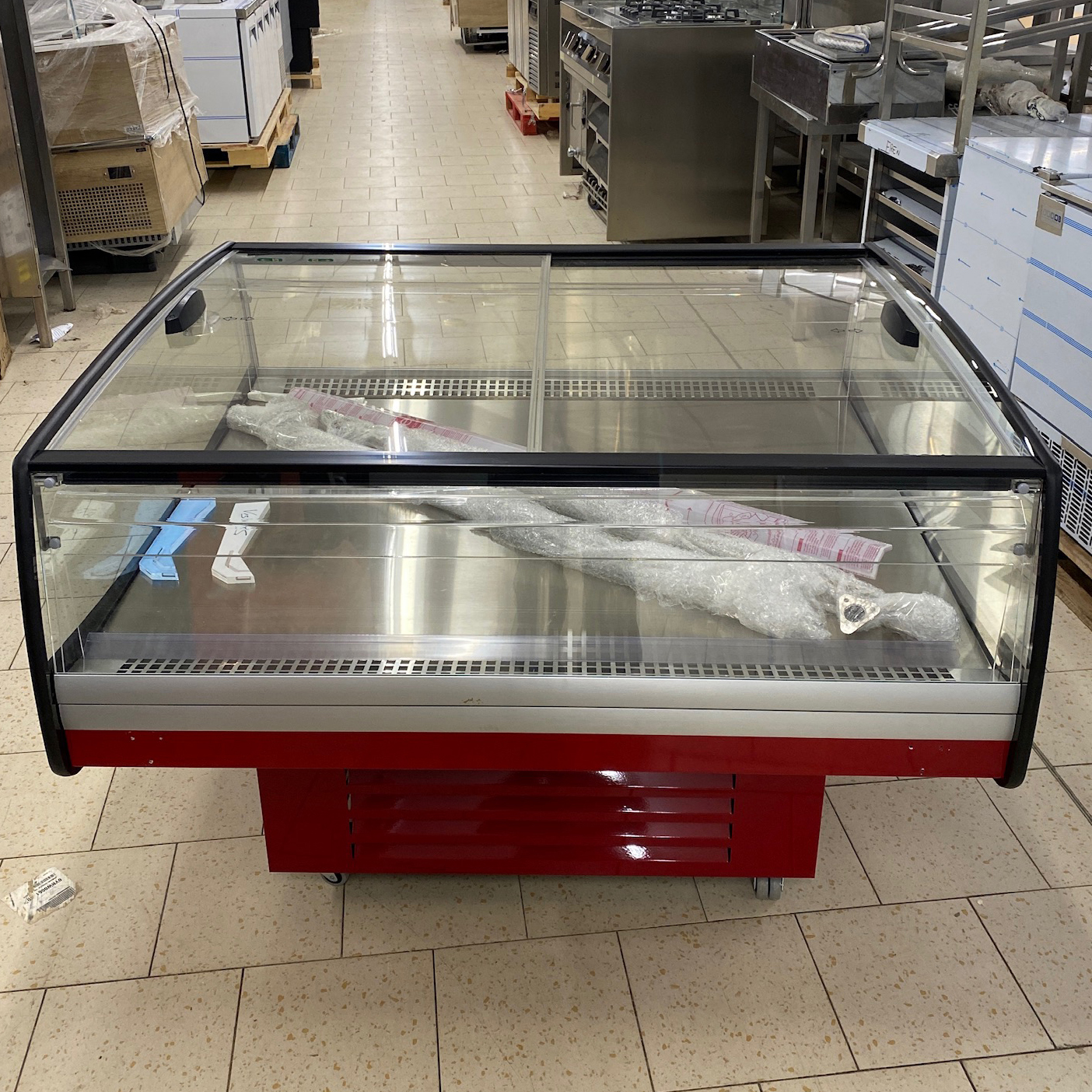 Vitrina isla promocional refrigerada con gas R-290, gran visibilidad y eficiencia energética.