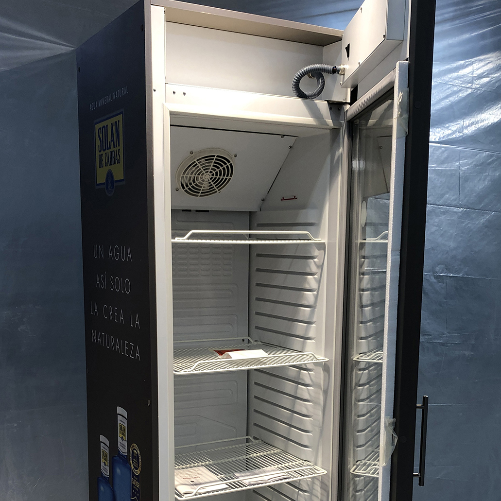 Nevera horizontal eficiente con cristal curvo y gas R-600a.